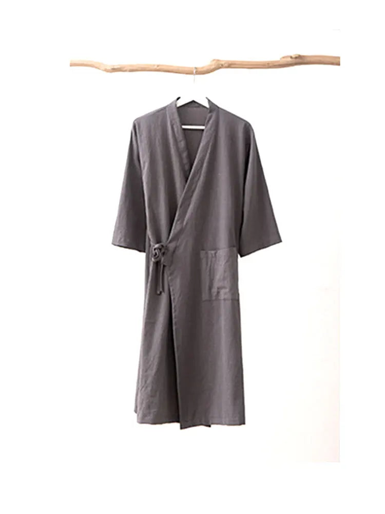 Women's Kimono with Sashes Cotton Linen Solid Long Sleeve Autumn Bathrobe V Neck Japanese Style Bathrobe Loose Solid Color